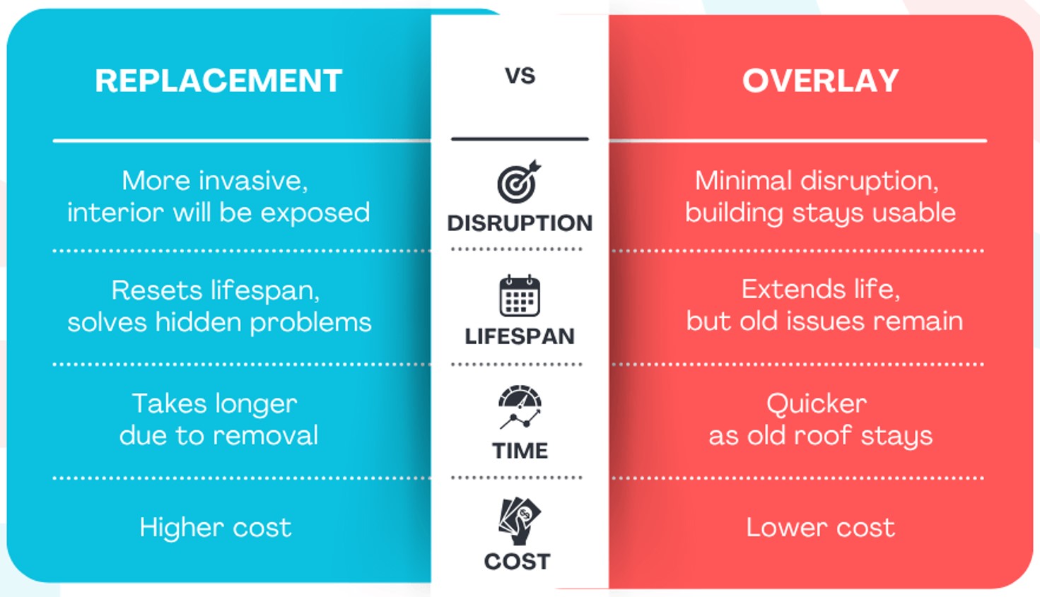 Replacement gives you a brand-new roof, solving hidden issues for maximum lifespan.