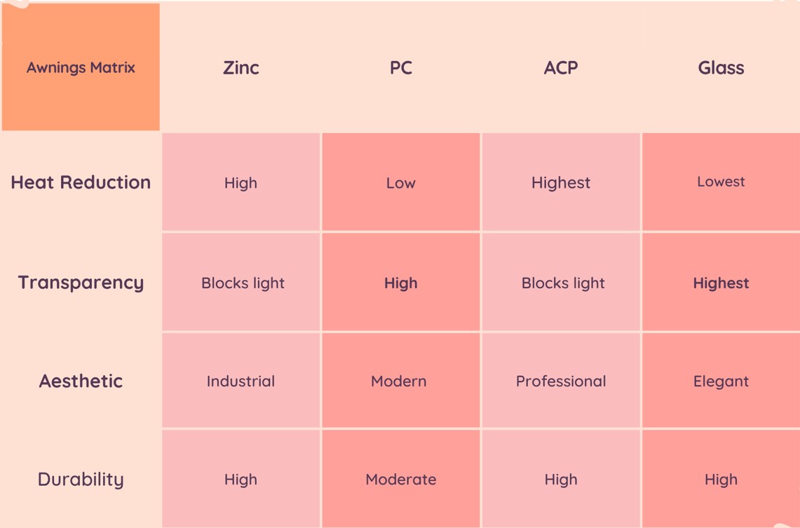 Polycarbonate is ideal for balconies, patios, and skylight-style awnings where you want natural daylight without the direct glare of the sun. It’s impact-resistant, flexible to install, and comes in clear, bronze, or frosted options to suit different lighting and privacy needs.